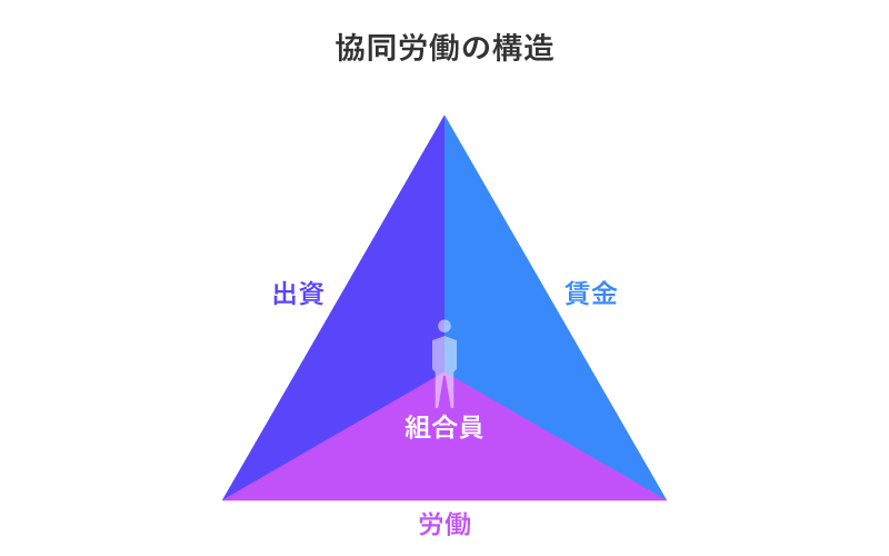 一方、労働者協同組合における労働は「協同労働」型となる。「出資」、「賃金」、「労働」は統合され、組合員が「株主」、「経営者」、「労働者」の三役をこなすことになる。これを一般的な企業の構造と比して「より民主主義的」とする評価もある。たしかに、多側面の一つとして、可能性として、そのような視点もあるだろう。