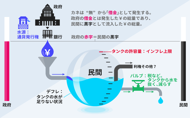 「政府の赤字=民間の黒字」というのは、貸借対照表をさわったことがあるものならば誰でもわかる、表の「左右の対照性」である。そこに通常の帳簿では扱うことのない水源という特殊項目が赤字側にあるのだ。その赤字側が水不足に汲々とするというのは、たとえるなら枯れない井戸をもつものの節水縛りプレイだ。プレイヤーが独自に設けた制限というほかない。