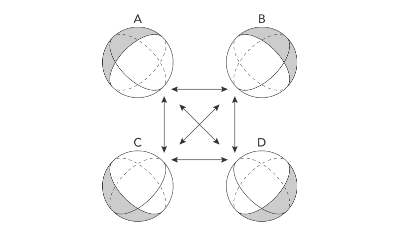 球Aにたいして中立をみる球Cと、球B、Dの関係は潜在的に変化する。